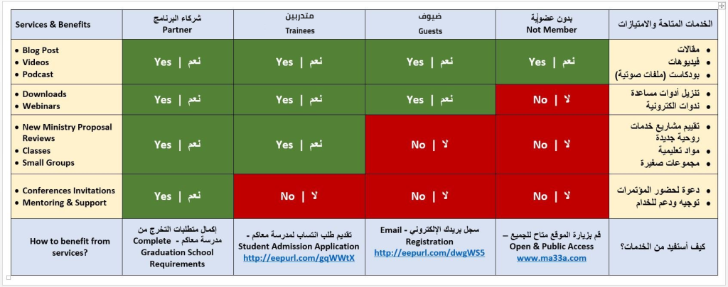 الجدول التالي يبين الخدمات المقدمة بكل مستوى وكيفية التسجيل للحصول عليها.