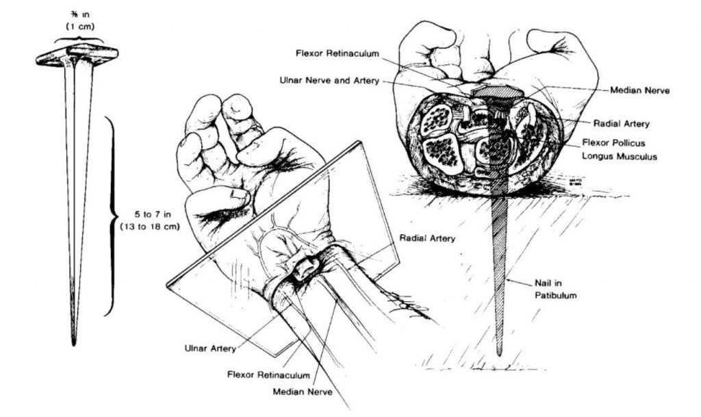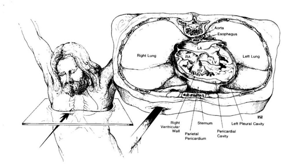 أغلب الظن إن أحد الجنود رغبة منه في التأكد أن يسوع قد مات طعنه بحربة فى جنبه اخترقت القفص الصدري ثم الحجاب الحاجز وغشاء القلب .
