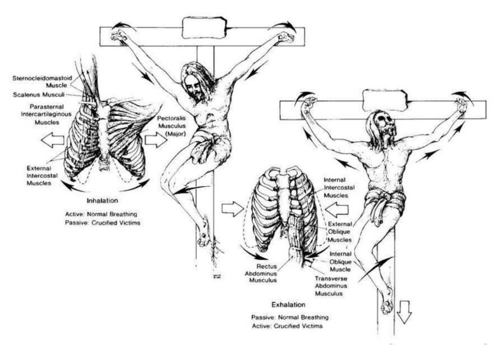 فى هذه اللحظة يحدث شيئا آخر. تبدأ ذراعاه تخوران وإذا بموجات متكررة من التقلصات الرهيبة عبر العضلات وبأوجاع عميقة وحادة. مع وجود هذه التقلصات يجد يسوع نفس غير قادر على أنه يدفع جسده إلى الأعلى . وأثناء تواجده معلقا من ذراعيه تصاب عضلت الصدر بالشلل وتتوقف عضلت القفص الصدري تماما عن أداء وظائفها ، يقاوم يسوع بشدة لكي يرفع نفسه حتى لمجرد أن ينال نفساً وآخر قصيراً ، أخيرا يتكون ثاني أكسيد الكربون في الرئتين وفى الجهاز الدموي من المرجح أنه من خلال هذه اللحظات تفوه بالسبعة كلمات الأخيرة المذكورة: